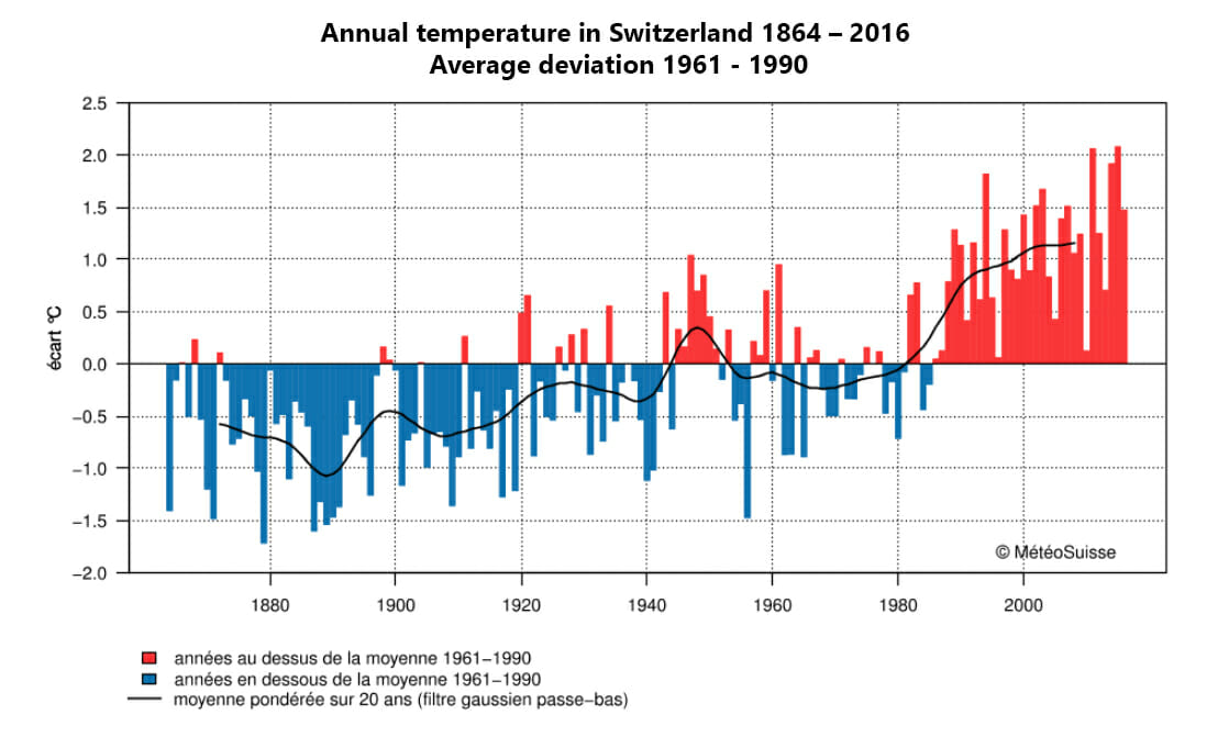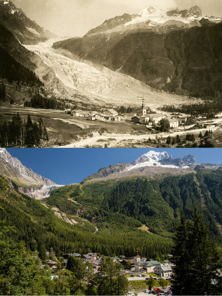 While temperatures have risen by 2.5°F (1.4°C) in France over the 20th century, they have risen by 3.6°F (2°C) in the European Alps. Warming is amplified in mountainous regions because as snow cover melts, it reveals dark rocks which absorb more of the sun’s rays. Year-on-year warming is becoming the trend with sixteen of the seventeen last years being the hottest on record [1].