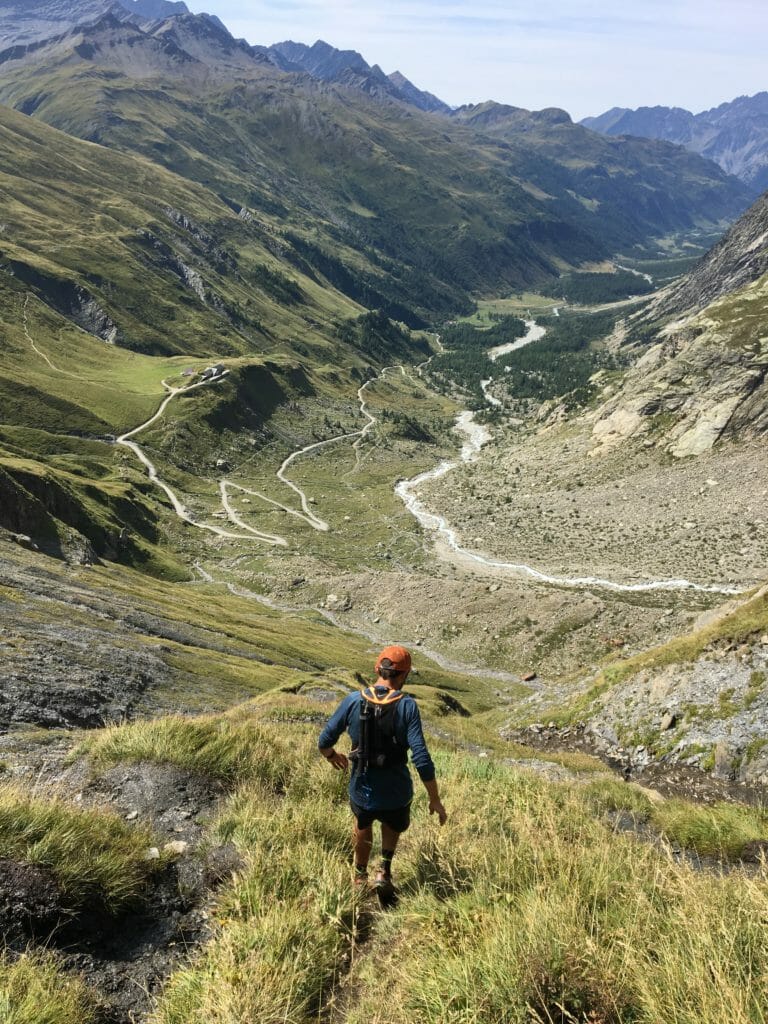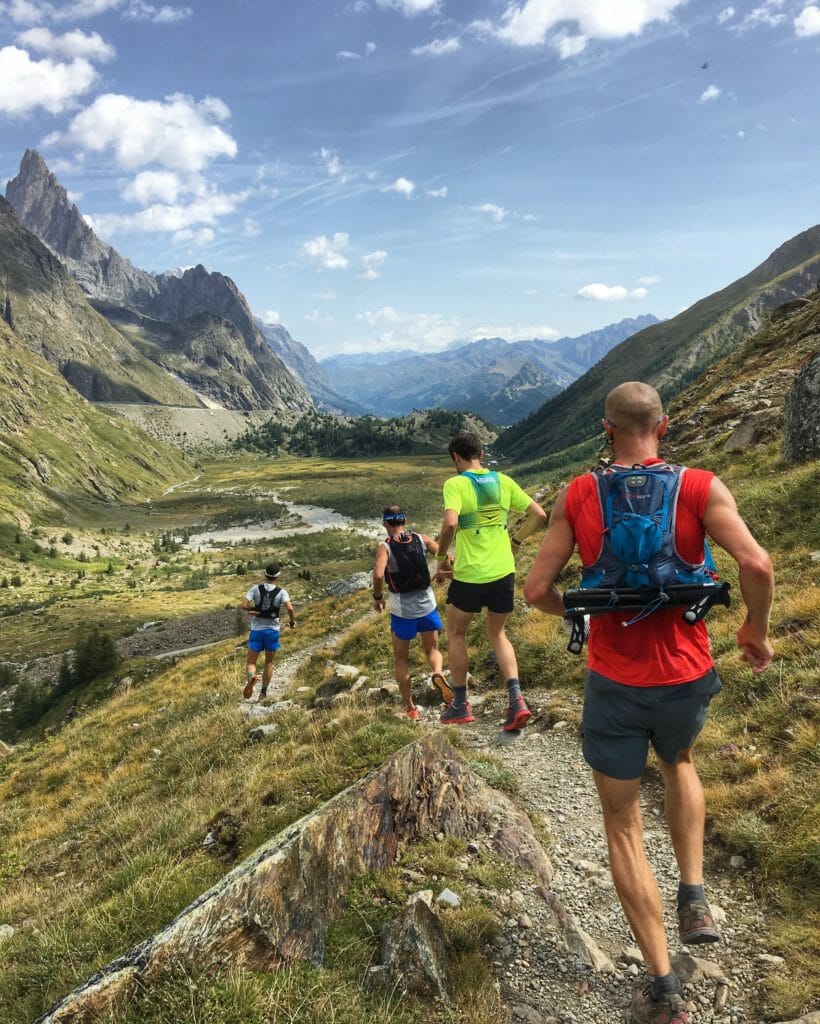 Another fantastic run is part of the Tour du Mont-Blanc from Col de la Seigne to Courmayeur. Again, utilize the local bus system – this time going in the opposite direction from the run described above. It’s a two euro bus trip up Val Veny to Lac Combal. Run via Rifugio Elisabetta to the Col de la Seigne for some beautiful bonus kilometers, then run back along the “TMB,” being sure to stop and feast at Rifugio La Maison Vieille di Giacomo. Ask for the “Topher” special– named for longtime UTMB friend Topher Gaylord. It’s the best meal I’ve ever had mid-run! Then, work off your meal by descending the steep single track back to Courmayeur.