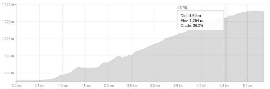 The last kilometer felt amazingly steep. In fact, I was convinced that just before the final stretch we had a 20%+ section of trail as I plodded along, moving as quickly as could, yet somehow only occasionally breaking into a jog. Maybe a gravity problem? The Strava profile shows that it actually was more or less steady, but even averaging 20% still left room for a few sections approaching 40%.