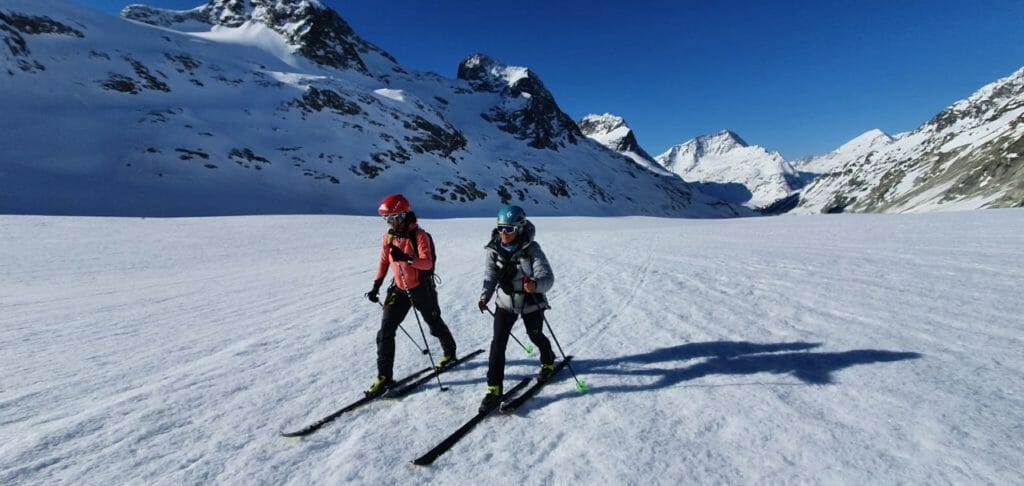 Fabre and Gerardi (r) on the move over the Otemma glacier during their record-setting Haute Route push from Chamonix, France to Zermatt, Switzerland. (Photo: Jon Bracey.)