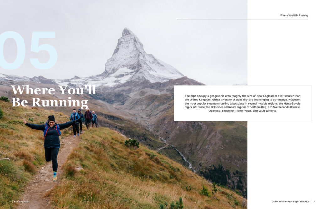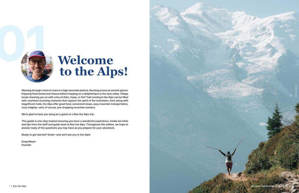 The first thing you’ll receive from Run the Alps when you sign up for a trip is our Guide to Trail Running in the Alps. To help you prepare, Run the Alps has gathered everything you need to know into this 80+ page full-color handbook. It’s available exclusively to guests coming on our trips. One part useful info, one part daydreaming, we hope you get pulled into the photos, planning, and info until you’re here in the Alps with us!