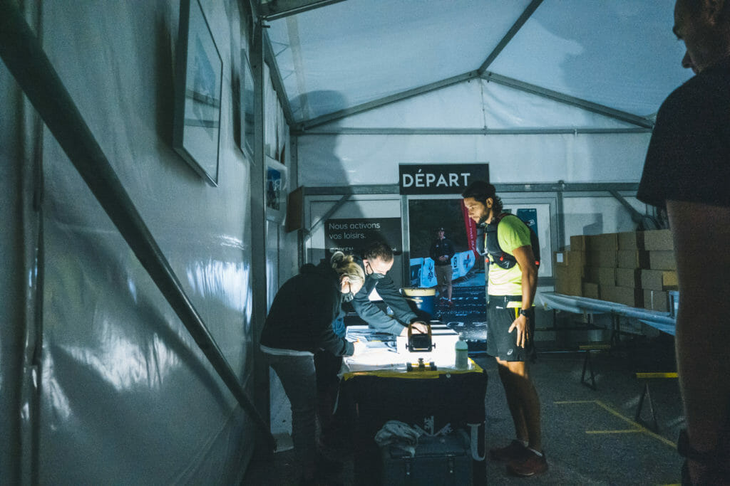 Greg: Yes. We just geared up, said our good-byes to our partners and walked through the tent, past the check-in tables. There was no music playing, no one announcing names of people as they started off. Since I don’t speak French, I just walked by and nodded to the volunteers. I kept going, figuring they would stop me if I was headed the wrong way. Once I exited the tent, I heard the beep of the chip reader, and it was clear I was on the course. The pavement had large painted arrows, then signs directing you to the trail.