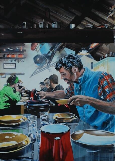 A painting by Michael Bignell of his nephew, Alister Bignell, serving dinner after a long day of trail running. Location: Les Motetts, on France’s border with Italy, along the Tour du Mont Blanc.