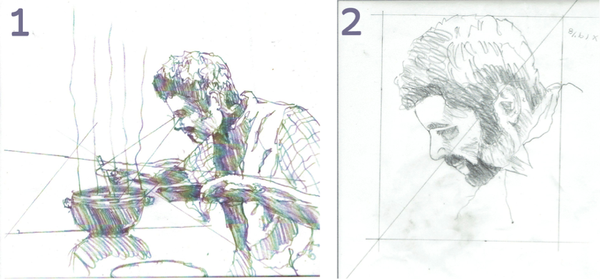 2. The second sketch shows a concentration of his face as a detail of the overall composition.