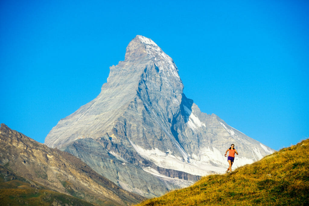 From Champéry, you’ll head by train, first-class through the Alps, finishing with a cog railway ride up to car-free Zermatt. The next day, you’ll trail run under the Matterhorn, stopping for pastries and coffee at the Hotel du Trift, before finishing your run at Hörnlihütte – the Swiss Alpine Club’s high mountain hut that’s been the starting point for ascents of the Matterhorn for more than a century.